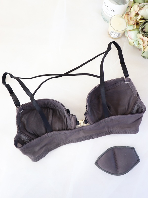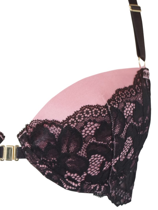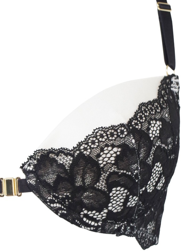大花柄レースがセクシーな配色デザイン。ホックは楽に着脱できるマグネットタイプを採用。浅めのカップで最大限に谷間を強調するデザイン。C字型ワイヤーとパッド入りのカップでデコルテに自然なボリュームをプラス。丸みのあるバストラインをメイクします。