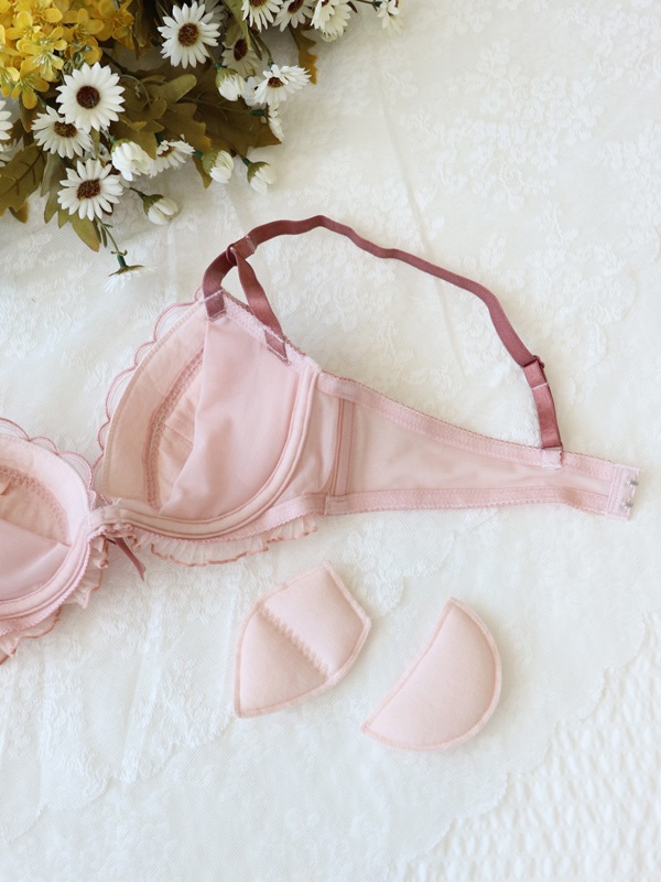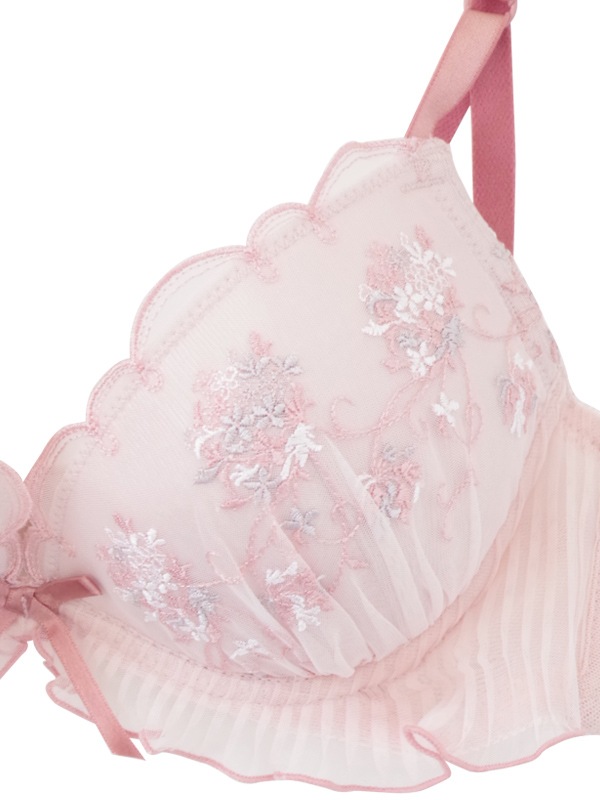 L字型ワイヤーと2枚のパッドがバストを脇から寄せ、トライアングルストラップで濃密な谷間をキープするWパッドパターン。