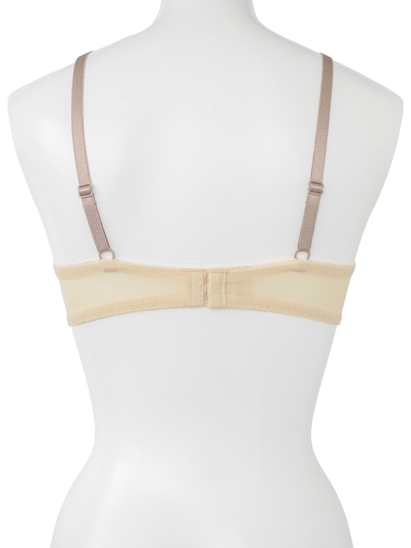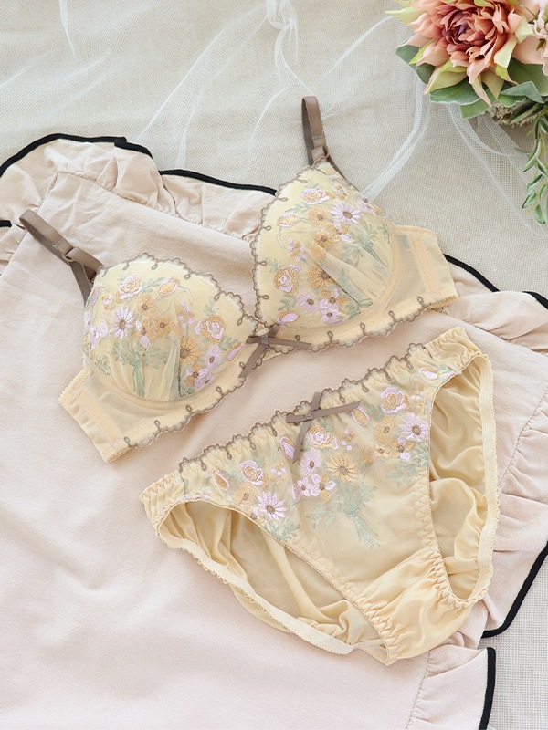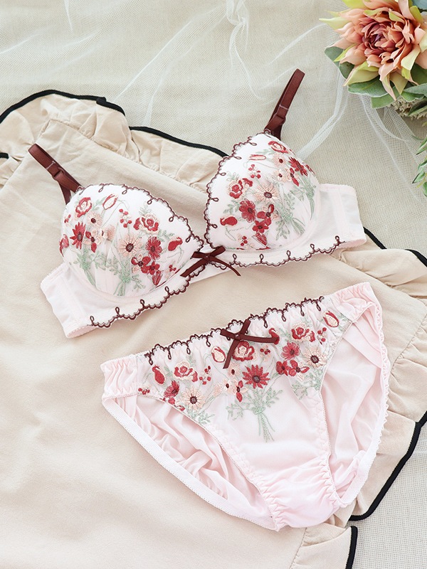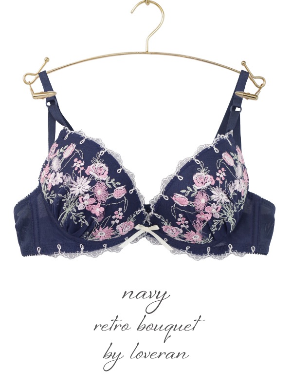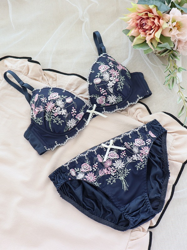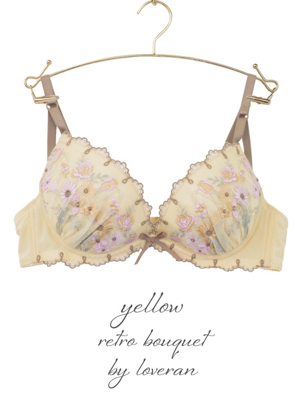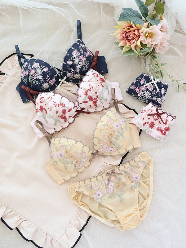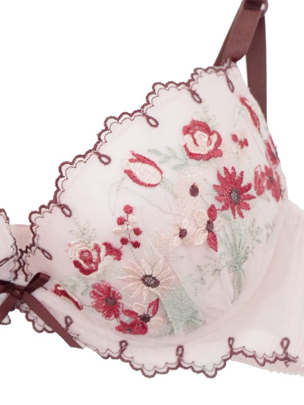 ブーケ柄を刺繍したチュールレースと配色デザインがキュートなブラセット。L字型ワイヤーと2枚のパッドでふっくら谷間をメイクするWパッドパターン。