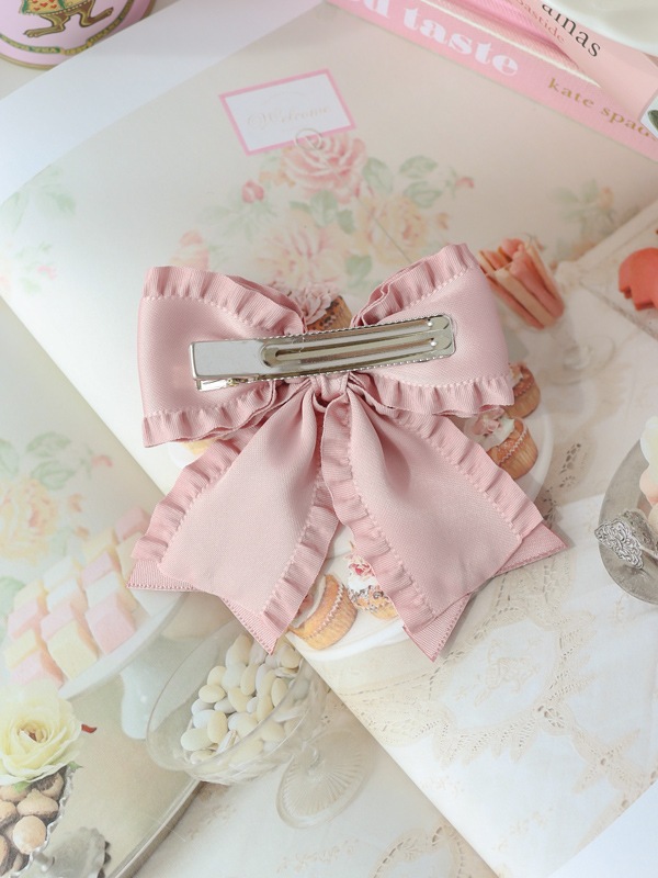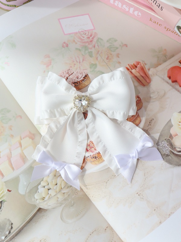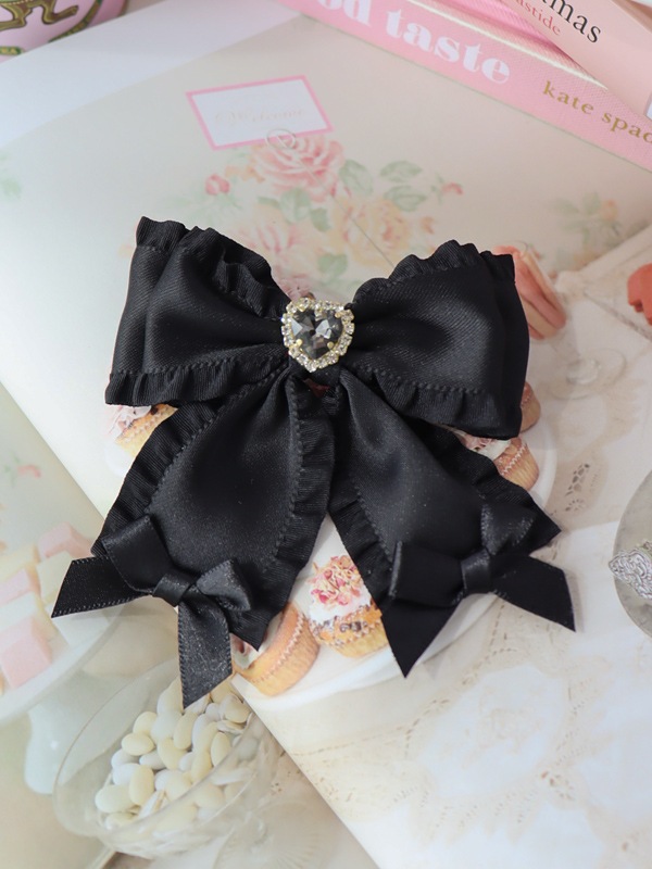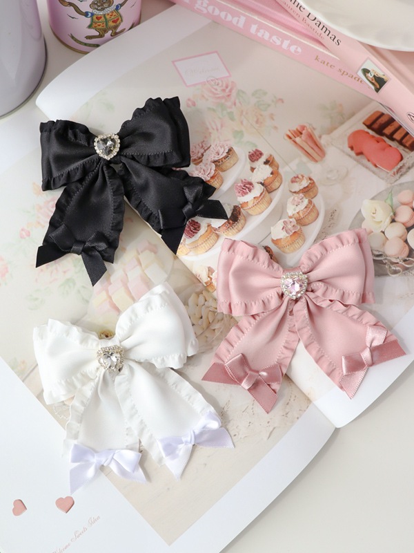 フリルつきサテンリボンにちょこんと乗ったハートビジューがかわいいヘアクリップ。