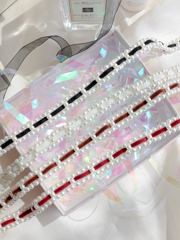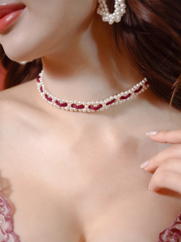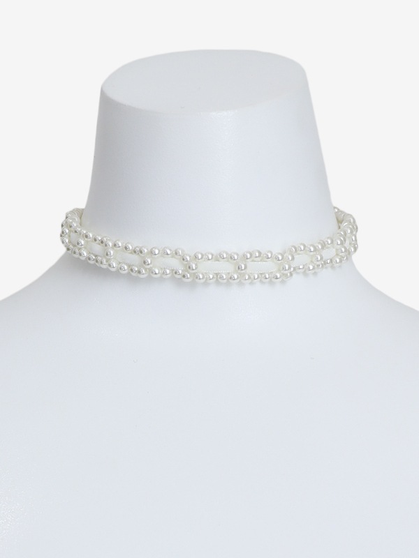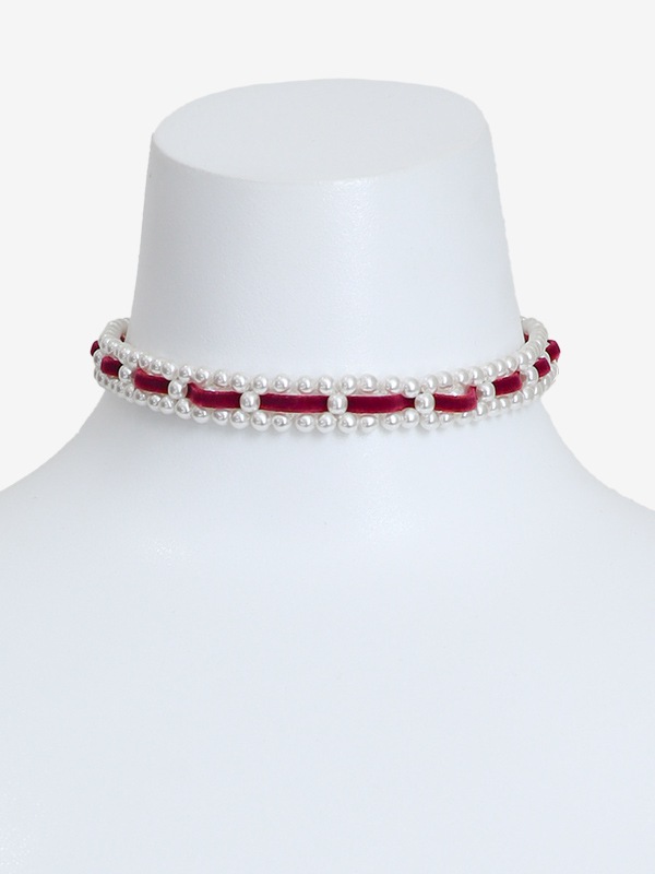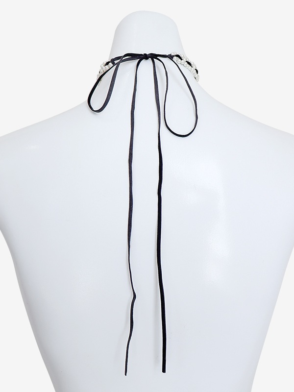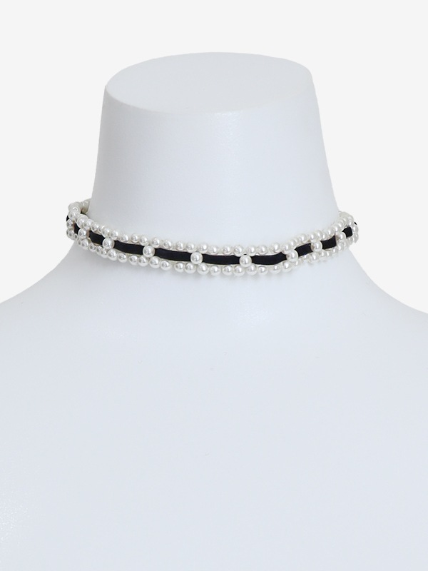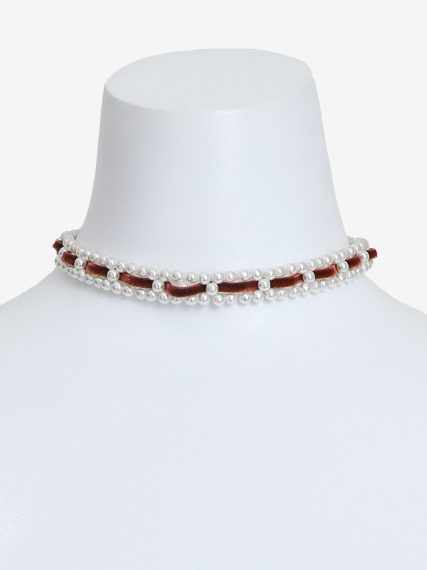 パールにスエード調のリボンを編み込んだレディなチョーカー。