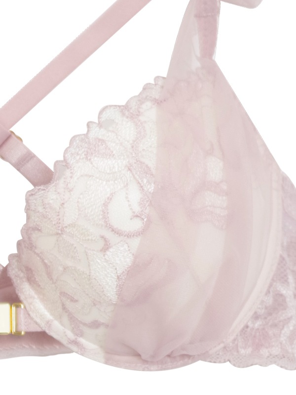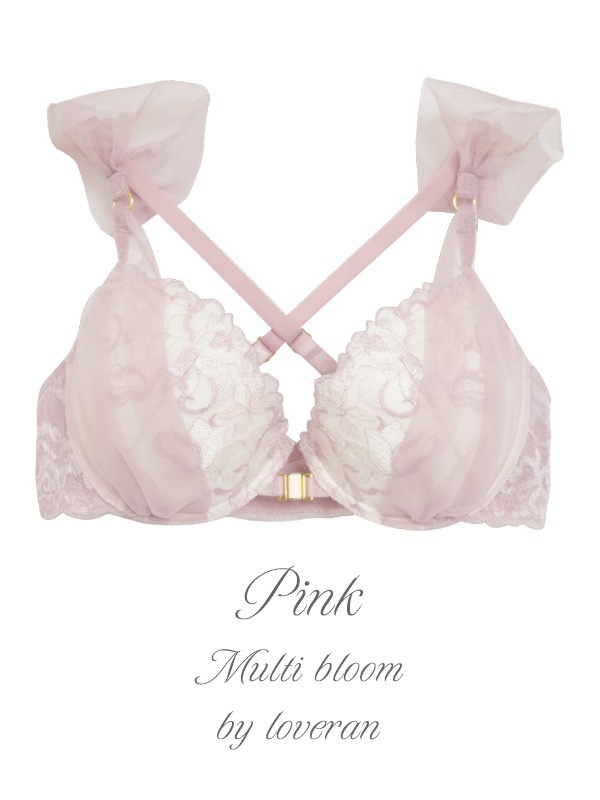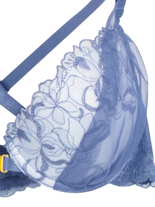 花柄刺繍レースにふんわりチュールを被せた大人可愛いフロントホックブラ。ホックは楽に着脱できるマグネットタイプを採用。