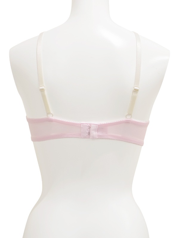 L字型ワイヤーで脇からバストを集め、サイドパッドでふっくらした谷間をメイク。薄いモールドカップで丸みのあるバストラインを演出。