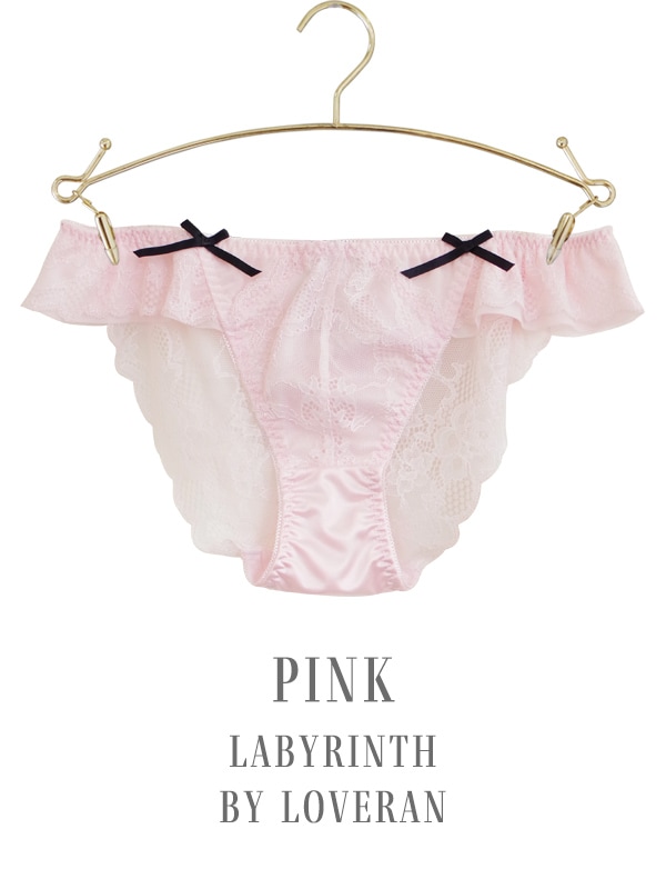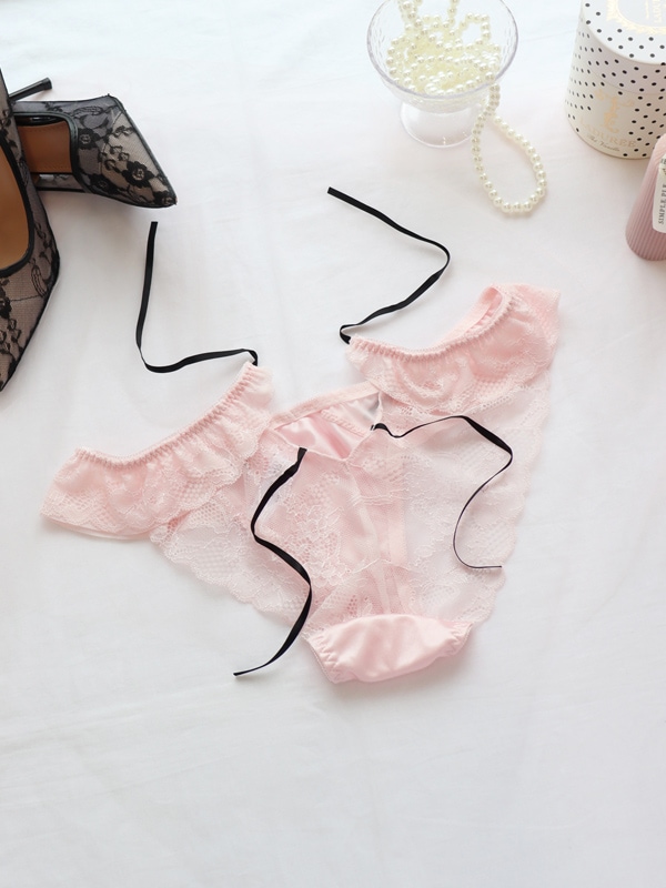 セットショーツはサイドフリル×バックレースタイプ。お尻には”ほどける”ダブルリボンの仕掛け付き!