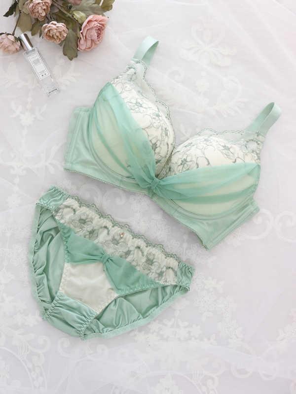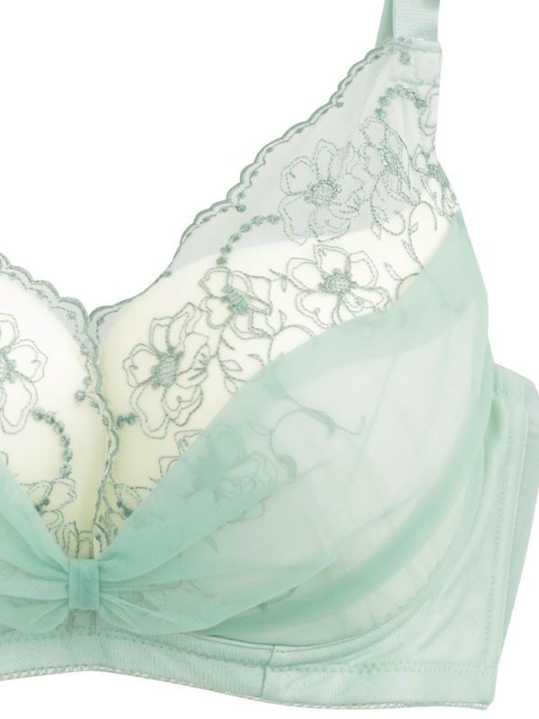 ラインアート風のフラワー刺繍を施したエンブロイダリーレースとリボンのように束ねたチュールドレープの組み合わせがフェミニンなブラセット。