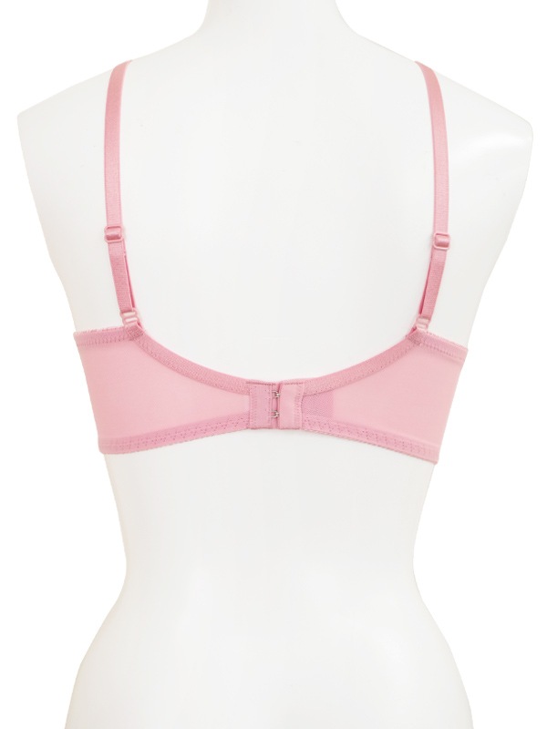 L字型ワイヤーと胸元のカシュクールでバストをぐっと中央に寄せ、脇高ベルトでサイドを抑えてすっきりしたボディラインをメイク。背中の段差を整え、安定した着け心地のU字バック仕様。