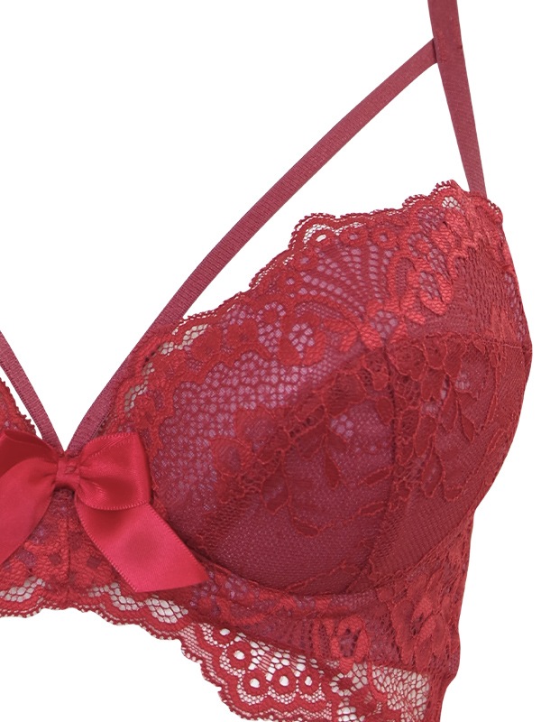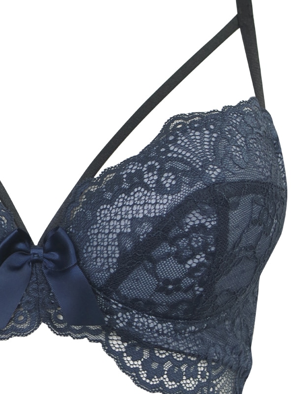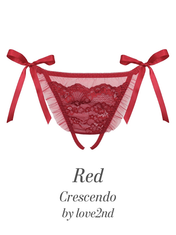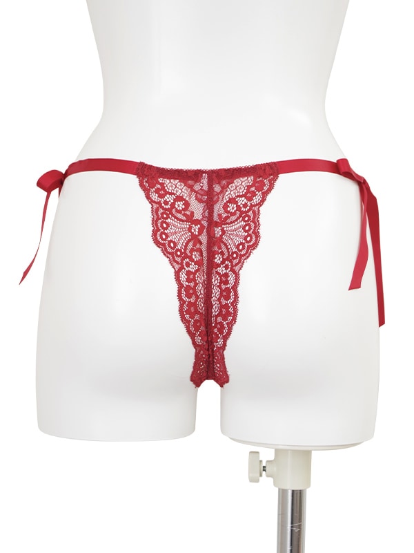 クロッチ部分が大胆に大きく空いたオープンクロッチTバックとのセットです。サイドは華奢なサテンリボンがするっとほどける仕様。