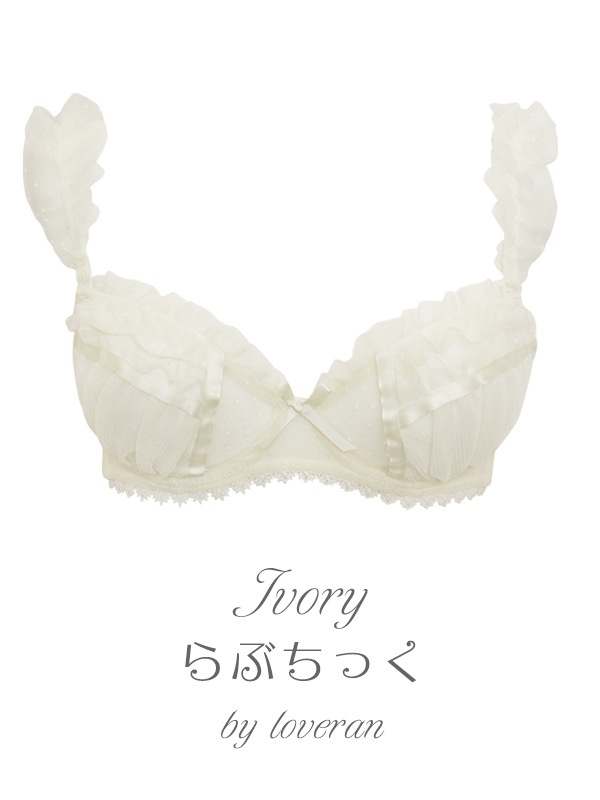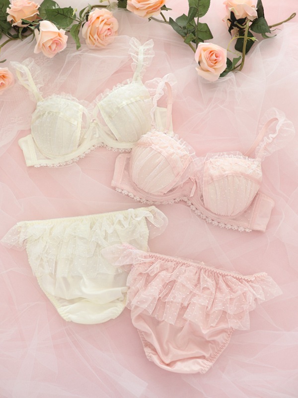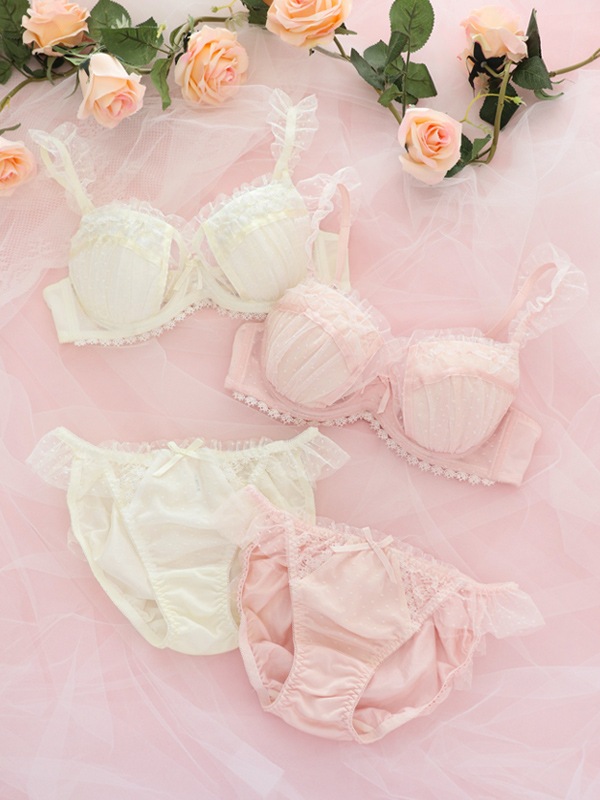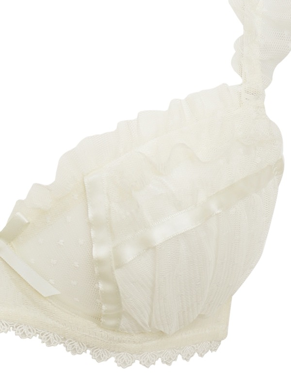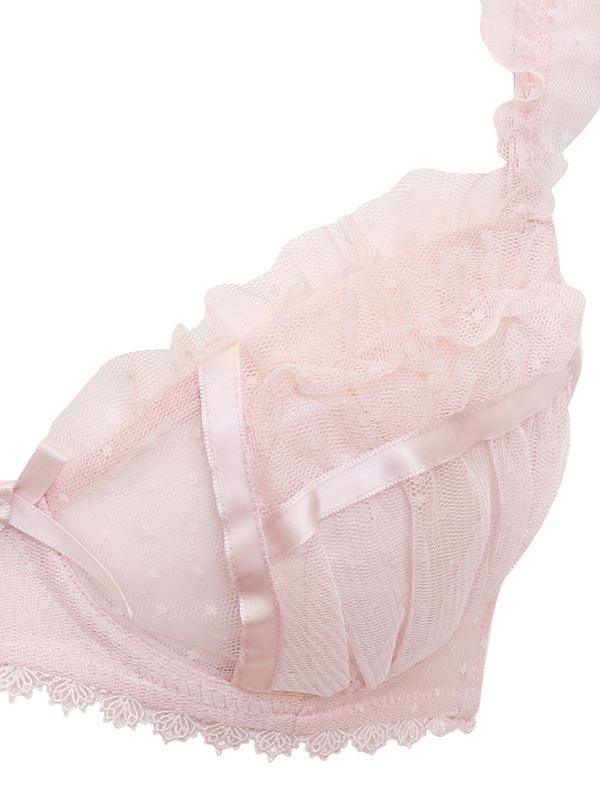 ふわふわのドットチュール×サテンリボンで甘々ガーリーな雰囲気のブラセット。裏あてをカットしたカップ内側から透ける素肌が色っぽい。
