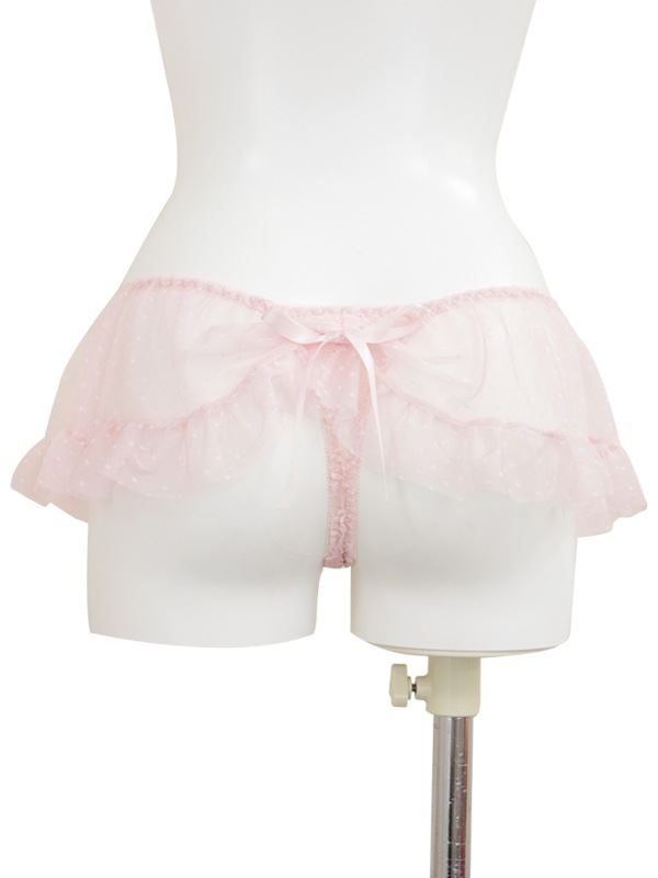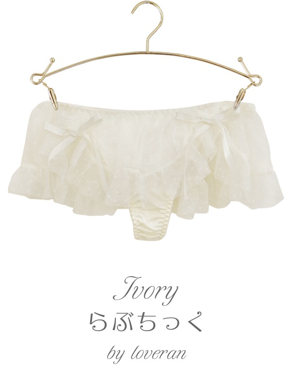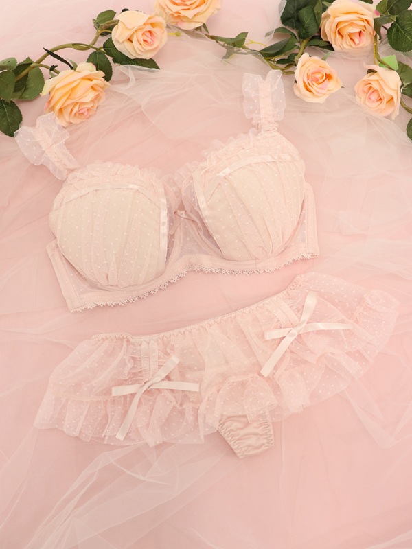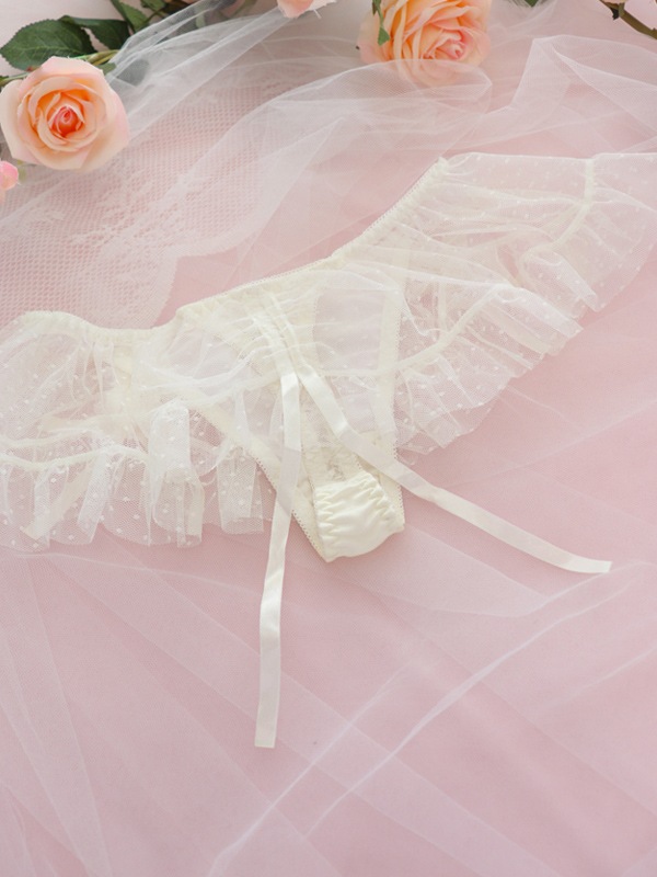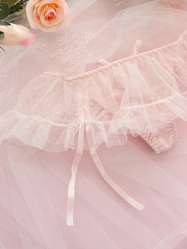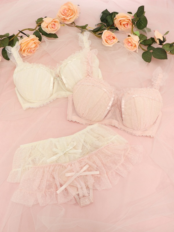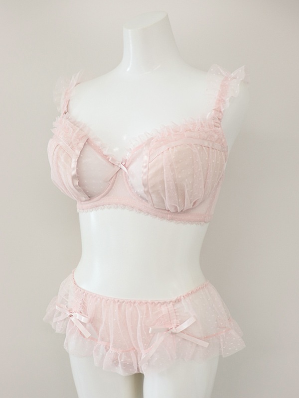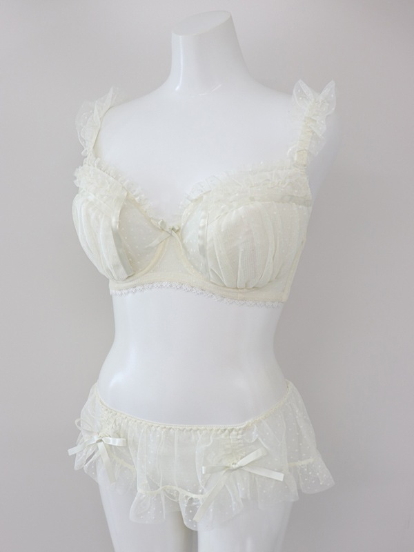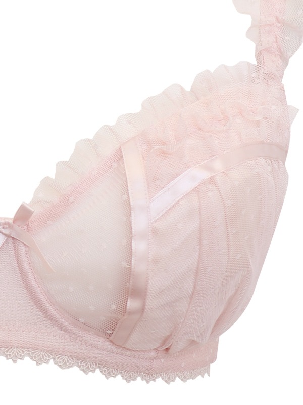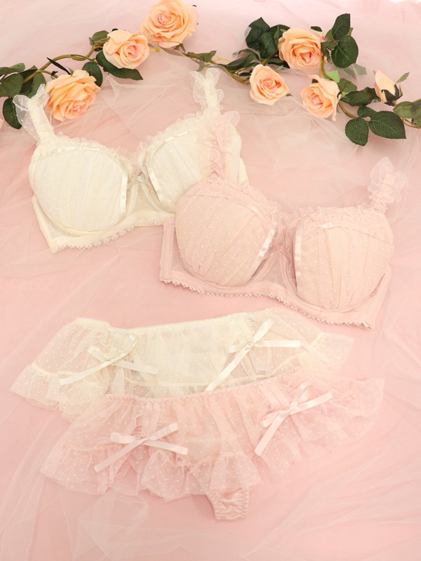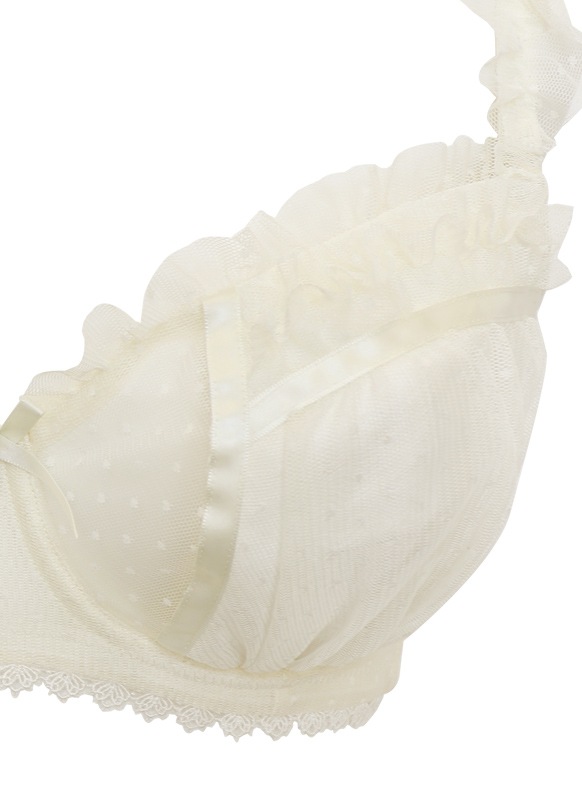 ふわふわのドットチュール×サテンリボンで甘々ガーリーな雰囲気に。裏あてをカットしたカップ内側から透ける素肌が色っぽい。