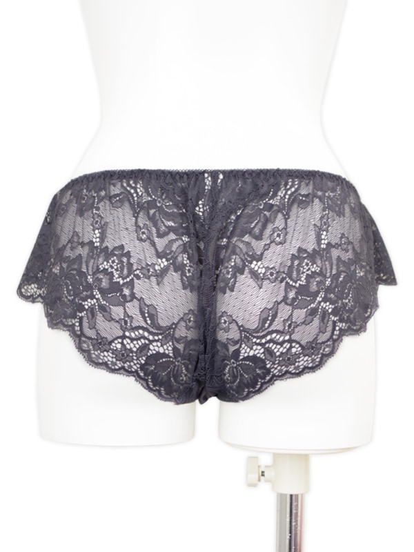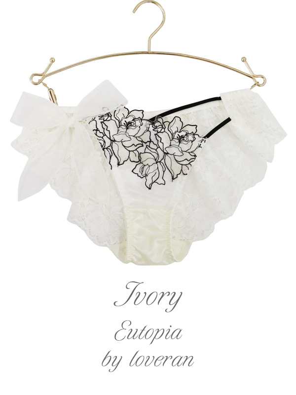 セットショーツは、アシンメトリーなデザインのほどけるリボンタイプ。大きなチュールリボンでほんのり甘く。バックレースで後ろ姿も美しくみせます。