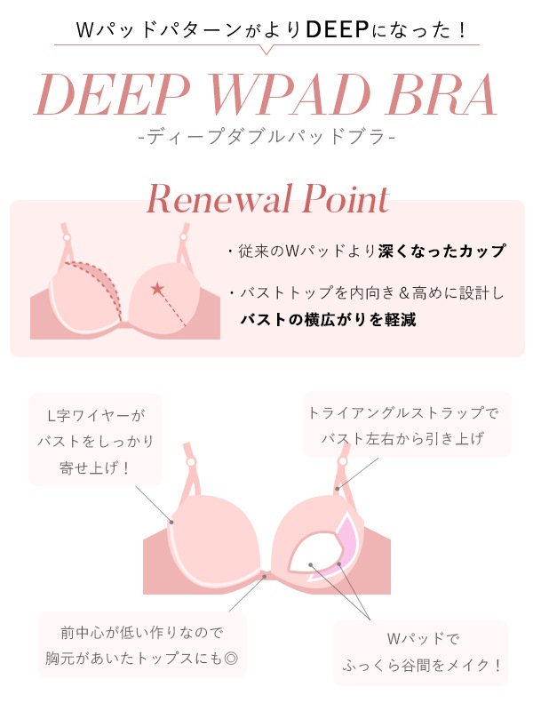 深めカップで集めたバストをしっかりおさめ、高く内向きにしたトップ位置で中央に寄った美しいバストラインをメイクする「ディープWパッドパターン」。
