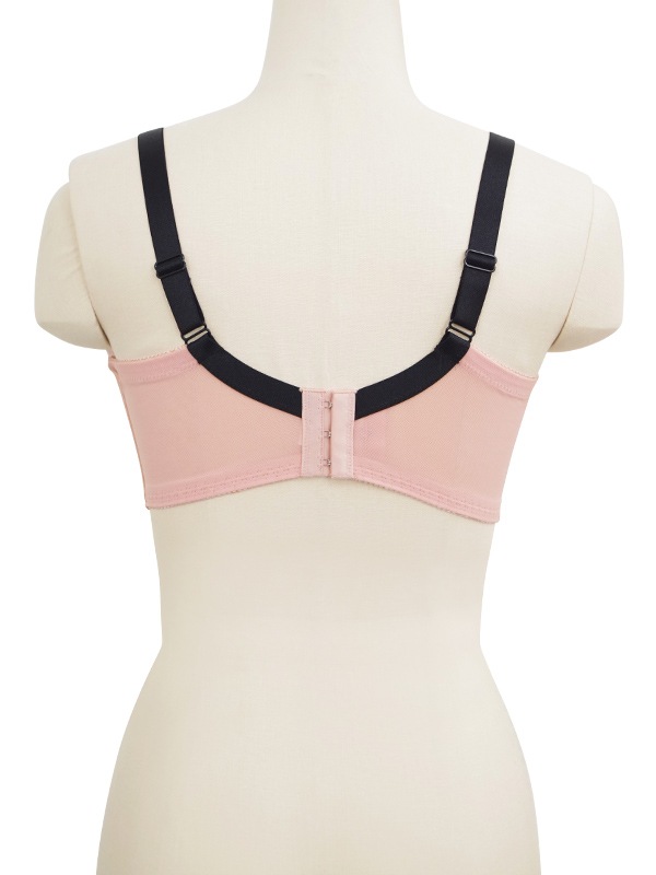 L字型ワイヤーと胸元のカシュクールでバストをぐっと中央に寄せ、脇高ベルトでサイドを押さえてすっきりしたボディラインに。背中の段差を整え、安定した着け心地のU字バック仕様。